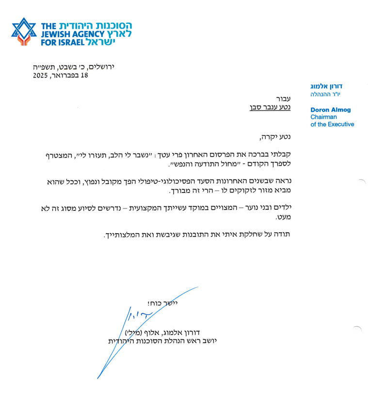 המלצה מאת אלוף דורון אלמוג, יו"ר הנהלת הסוכנות היהודית.